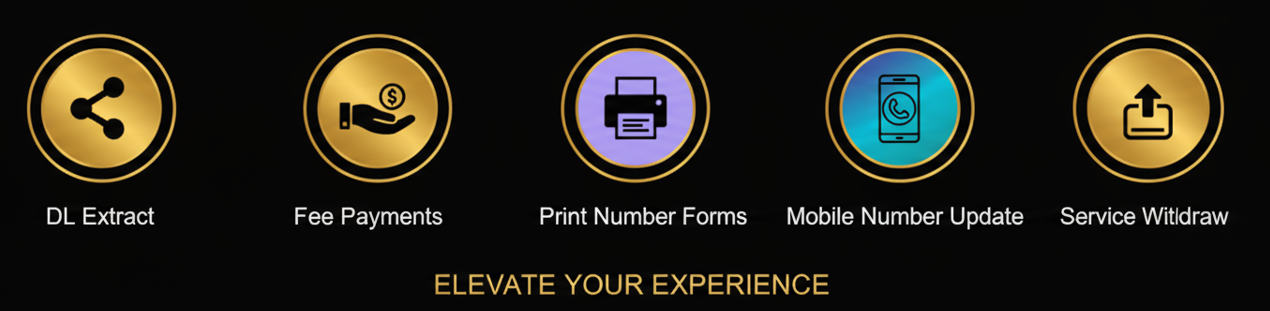 DL Extract, Fee Payments, DL Mobile Number Update, DL Service Withdraw, DL Services (Replace of DL/Others), Class of Vehicles to an Application, DL Appointments, Tutorial for LL Test, Complete your Pending Application, Check Payment Status, DL Upload Document, Online LL Test.